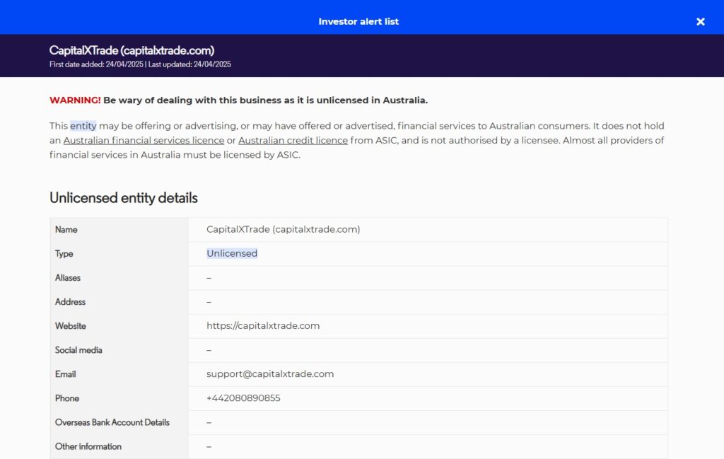 CapitalXTrade is an online trading platform that has been identified as a scam. Its website is currently offline, making it impossible for investors to access their accounts or trade. Authorities have flagged this broker as unlicensed in Australia, and it has received a warning from the Australian Securities and Investments Commission (ASIC).