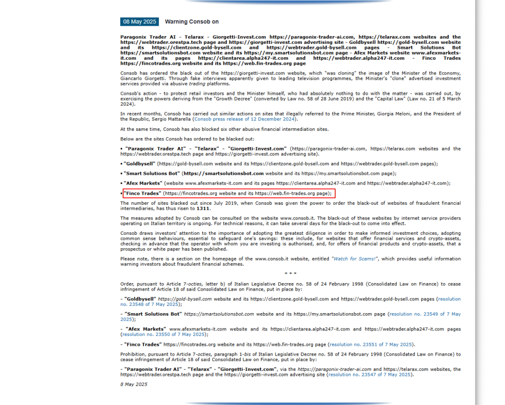 Finco Trades has raised multiple red flags, making it a highly risky broker. Recently, CONSOB (Italy’s financial regulator) issued a warning against it for operating illegally. The platform has a Trustscore of just 1/100, which is extremely poor.