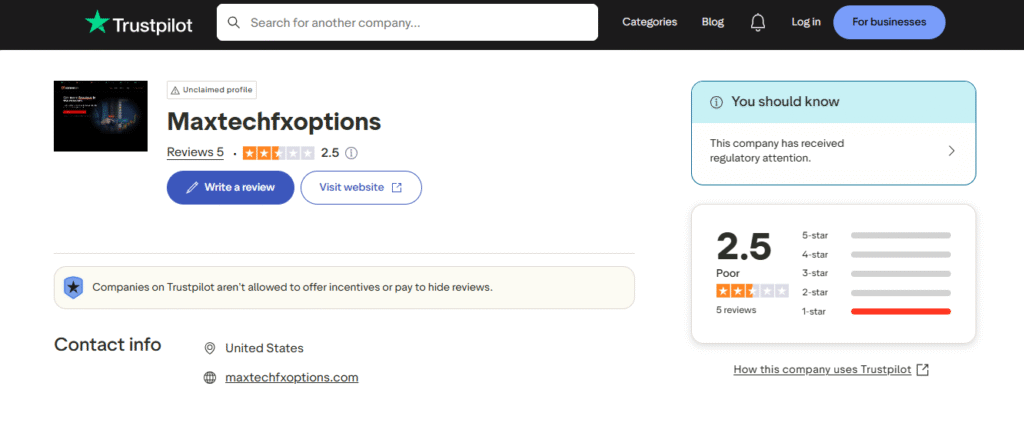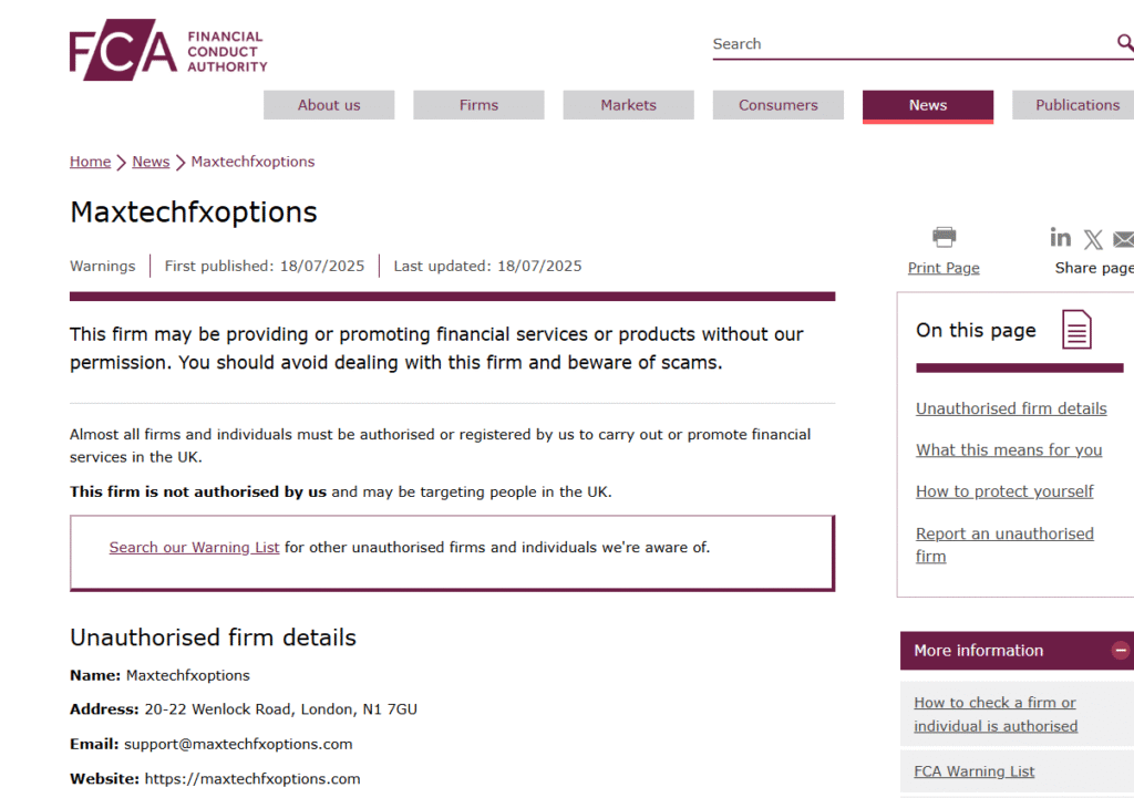 Maxtechfxoptions has been identified as a high-risk broker after the UK’s Financial Conduct Authority (FCA) warned on July 18, 2025, that the broker may provide financial services without authorization. Similarly to other scam sites, the broker utilizes a common template as its brokerage site, has claimed presence in the UK, and has no regulation. There are numerous red flags with the broker with a Trustpilot rating of 2.5/5 (Poor) and Trustscore of 0/100. Overall, funding (with) this broker is a major risk with no legal protections. Maxtechfxoptions appears to be a scam.