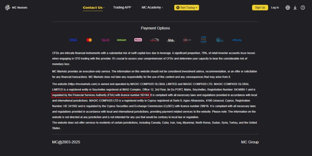 MC Markets positions itself as a global trading platform that provides commodities, indices, CFDs, Forex, and cryptocurrencies. On its website, it claims to be regulated by the Seychelles Financial Services Authority (FSA) and registered as a Money Services Business (MSB). However, after checking, no official record of MC Markets exists with the Seychelles FSA. It’s also essential to remember that MSB does not oversee CFD or forex brokers.