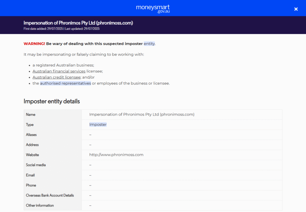 Phronimoss, also called Phronimos Group, shows many warning signs of being unsafe. On July 29, 2025, the Australian Securities & Investments Commission (ASIC) warned that the company may be offering services without permission. The broker claims to be regulated by big authorities like FCA, CySEC, SCB, and ASIC, but no proof of licenses exists. The website gives no contact details and has no trading software, which adds to the risk. Reviews are mostly negative, with a Trustpilot score of 2.8, WikiFX 1.07/10, and Scam Detector 7.6/100. These red flags suggest Phronimoss is not trustworthy, so investors should stay away and choose only licensed brokers.