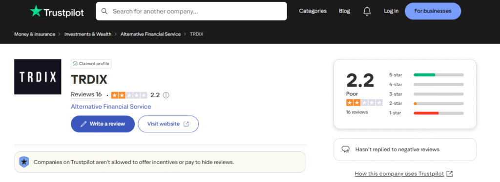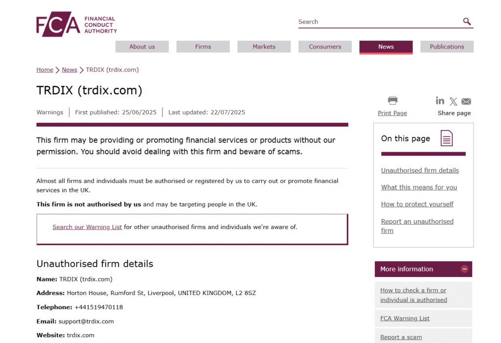 TRDIX is listed as a high-risk broker after the UK’s Financial Conduct Authority (FCA) issued a warning on July 22, 2025 stating the company may be providing financial services without any regulation. TRDIX claims to have a UK address and presents itself as a global trading platform for investors, but it is unregulated. TRDIX has a Trustpilot rating of 2.2 (Poor), and a Trustscore of 30/100. It shows multiple warning signs. It would be incredibly risky to trust this broker with real money as there are no protections for investors. TRDIX appears to be a scam broker.