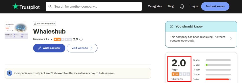 One of the largest issues raised in this WhalesHub review is the Trustpilot rating, which does not provide the correct rating. The website displays a proud Trustpilot 4.7 out of five rating. However, it does not disclose that it has just a 2-star rating on its Trustpilot profile page. Obviously, this is an attempt to misrepresent its reputation.